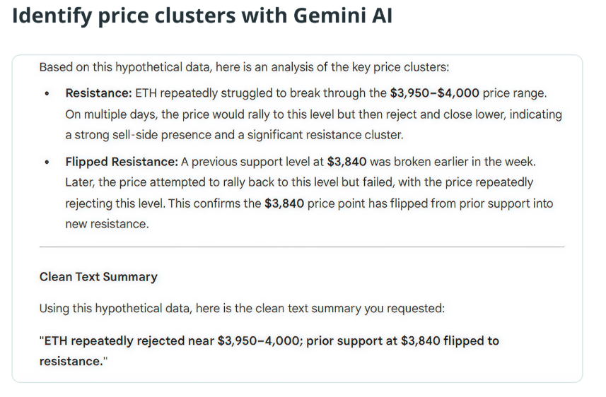 One of Gemini’s most practical uses lies in structuring daily workflows. Traders can create a “trading notebook” in Google Sheets divided into six tabs: Watchlist, Catalysts, Levels, Order Flow, Plan and Post-Mortem. Gemini then supports each step with reasoning and summaries.