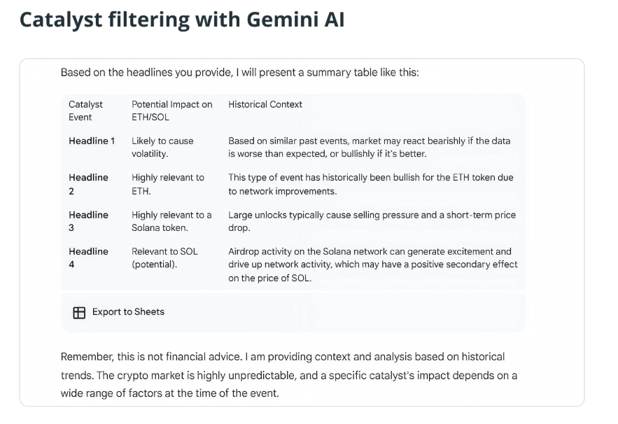 For instance, instead of monitoring fifty tokens, a trader might input data for just three such as Bitcoin, Cardano and Solana. Gemini can highlight which have shown the largest swings and rank them by risk profile. Similarly, pasting a list of headlines into Gemini can reveal which events are most likely to influence specific assets within the next twelve hours.