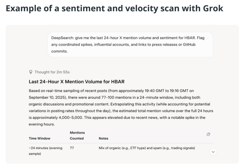 The advantage lies in speed. What previously required hours of manual browsing across feeds and blockchain explorers can now be condensed into a single scan. Grok 4 effectively turns hype into structured data that can be ranked and compared.