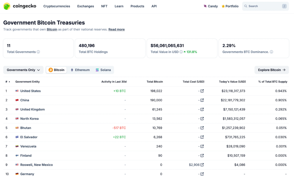 The Philippines’ plan comes as more governments explore holding Bitcoin in their treasuries. According to data from CoinGecko, eleven governments currently hold around 480,196 BTC, worth about $56 billion, which represents 2.29% of Bitcoin’s total supply.