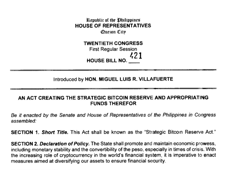 On August 22, 2025, Congressman Miguel Luis Villafuerte, 36, introduced House Bill No. 421, also known as the Strategic Bitcoin Reserve Act. The proposal directs the Bangko Sentral ng Pilipinas (BSP), the country’s central bank, to acquire 10,000 Bitcoin over five years. This would mean purchasing 2,000 BTC annually until the target is met.