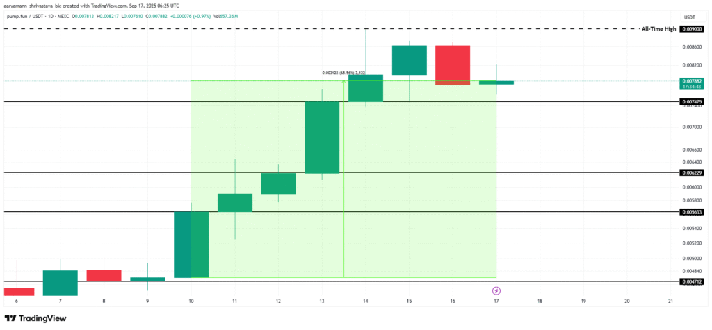 However, network growth has slowed, signalling fewer new entrants. This divergence between rising activity from existing holders and declining adoption, raises questions about sustainability. Should selling pressure mount, PUMP risks falling below the $0.0074 support, with $0.0062 as the next downside target.