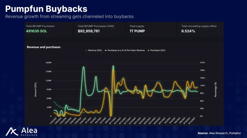 According to Blockworks, this shift helped Pump.fun claw back market share, with platform revenue surpassing $834 million, annualised revenue hitting $492 million and daily buybacks averaging $68 million. This liquidity injection has reinforced Pump.fun’s sustainability while drawing both creators and speculators back into its ecosystem.