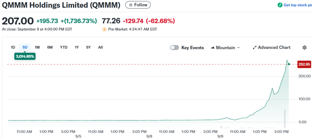 Investors responded with enthusiasm. QMMM shares surged more than 2,100% intraday before closing Nasdaq trading up 1,737%, marking one of the most dramatic single-day moves for a crypto-linked stock this year.